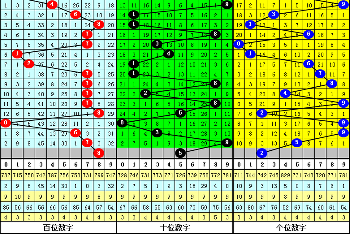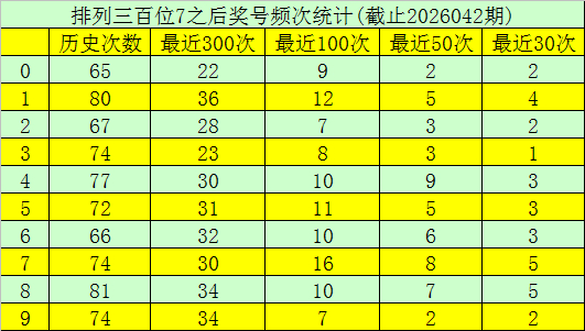 第一位杀号:上期第一位奖号为7,第一位奖号7历史上出现731次,前100次该位开出奖号7之后,下期号码0-9出现次数从高到底区别为:号码7→16次,1→12次,5→11次,4、6、8→10次,0→9次,3→8次,2、9→7次。